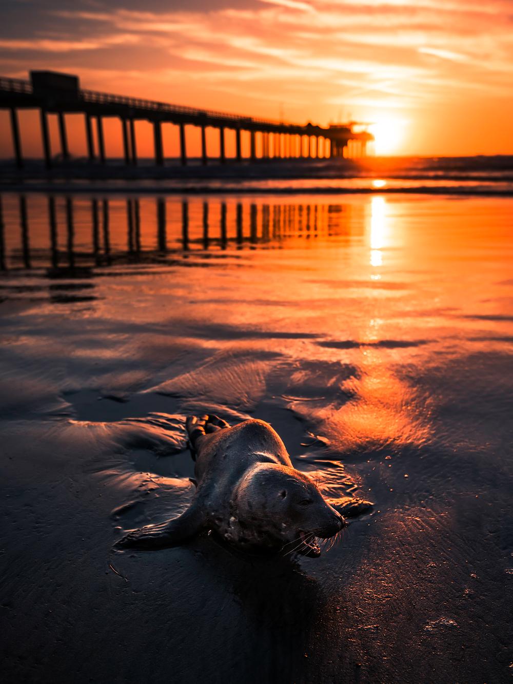 A lost seal pup on the beach during sunset in La Jolla, California, 2019.